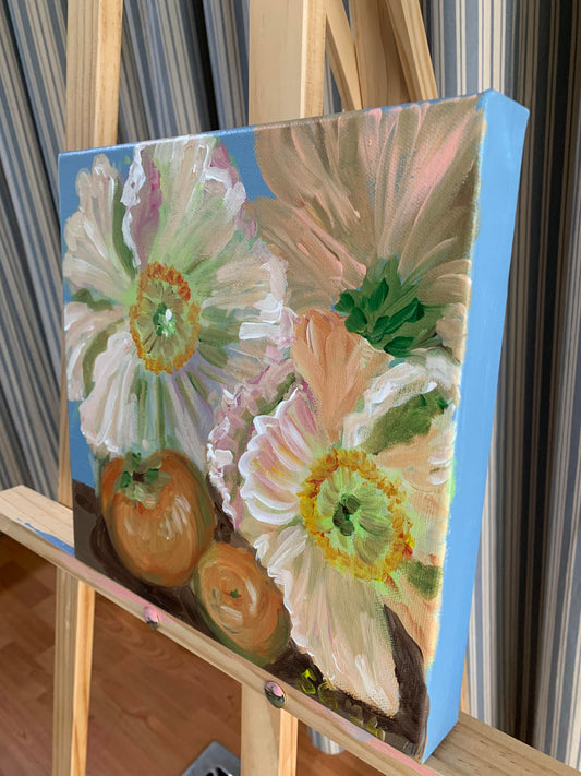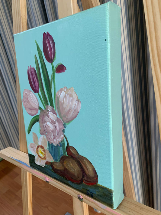 The strategic positioning of the florals and fruit remind of the Dutch painters with a contemporary twist.